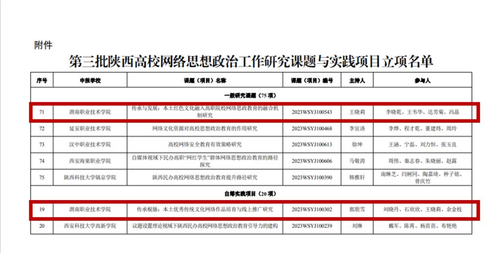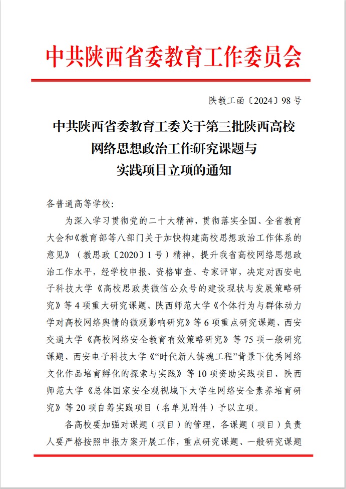 近日,陕西省委教育工委下发了《关于第三批陕西高校网络思想政治工作研究课题与实践项目立项的通知》(陕教工函〔2024〕98号)文件,世俱杯2个项目获批立项,其中一般研究课题1项,自筹项目1项,立项数量取得新突破。