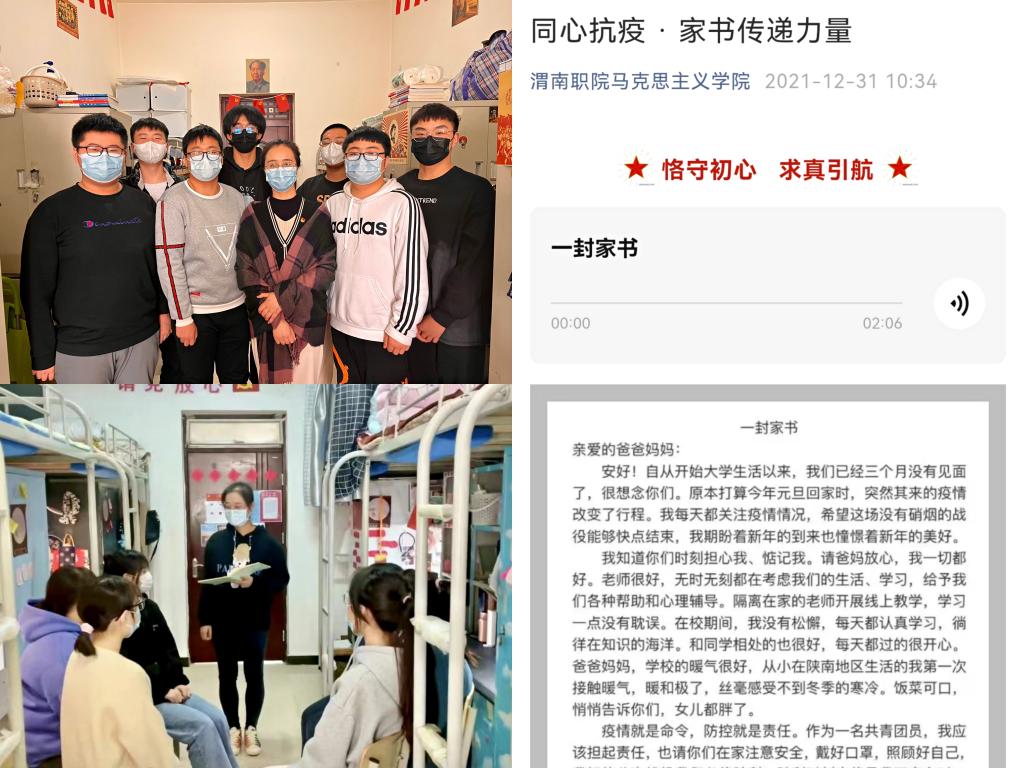 为鼓舞全体师生同心抗疫、共渡难关的信心,世俱杯精心策划了“同心抗疫·家书传递力量”“同心抗疫·思政微课堂”系列栏目,通过微信公众号平台推送宣传。家书传递温暖、传递力量,在家书中学生向父母表达思念与感恩,截至目前,共收到家书百余封,推送11篇。青年教师石欣欣、副教授余金枝、向琪三位老师,结合课程内容和疫情防控工作实际,分别以“践行伟大抗疫精神”“培养法律意识”“大学生心理调适方法”为内容,深入学生宿舍进行微讲授,倾听学生心声、拉近师生距离、增进师生情谊。不论是家书传递还是思政微课堂,都是推进思政课守正创新的积极践行,实现思政“小课堂”和社会“大课堂”同频共振,在战疫中凝聚强大精神力量。