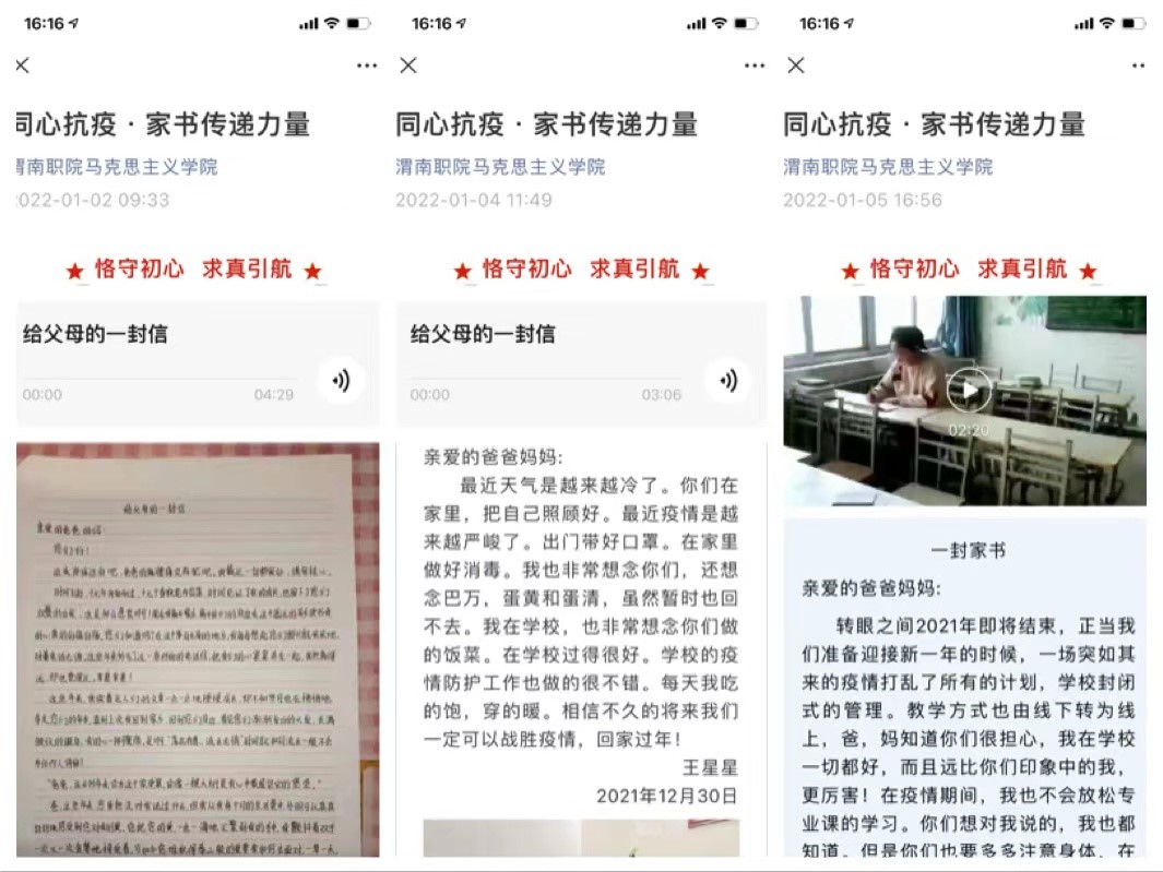---创新思政课教学模式,传递坚定力量。为鼓舞全校师生同心抗疫、共渡难关的信心,世俱杯sjb官网精心策划了“同心抗疫·家书传递力量”和“同心抗疫·思政微课堂”系列栏目。截至目前,共收到学生家书百余封,通过新媒体平台推送23封,学生在家书中向父母表达着思念与感恩之情。四位思政老师,结合课程内容和疫情防控工作实际,分别以“践行伟大抗疫精神”“如何调节不良情绪”“如何培养法律意识”“青年的责任与担当”等内容,深入公寓与学生面对面交流沟通,倾听学生心声、拉近师生距离、增进师生情谊,实现思政“小课堂”和社会“大课堂”同频共振,坚定师生战胜疫情的信心。同时,世俱杯sjb官网3名行政干部深入宿舍为学生庆生,送上暖心的生日祝福。