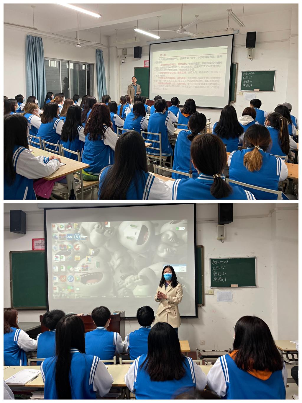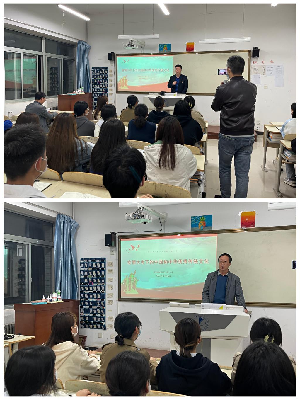为统一全校学生思想,让青年学生“知晓各国抗疫大势,增强自觉抗疫意识,争做抗疫防疫战士”,全校青年学生同上“抗疫”思政大课拉开帷幕。3月16日至17日晚,学校党委副书记党少平、王录军,副院长王韦华分别深入师范学院、护理学院和机电工程学院,利用晚自习时间以主题班会的形式,围绕“疫情大考下的中国和中华优秀传统文化”这一主题与青年学生探讨交流。