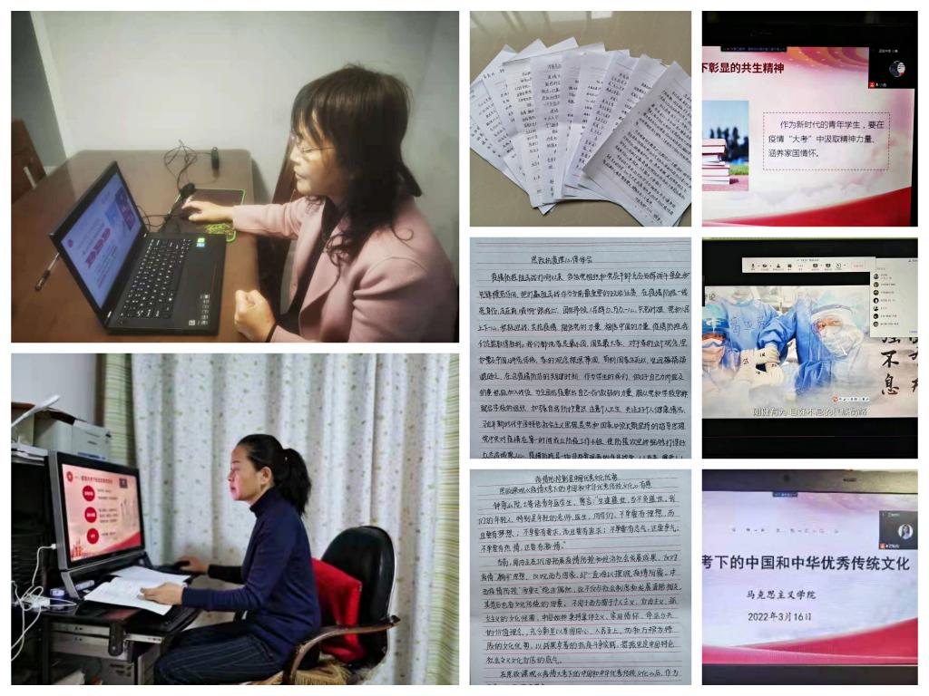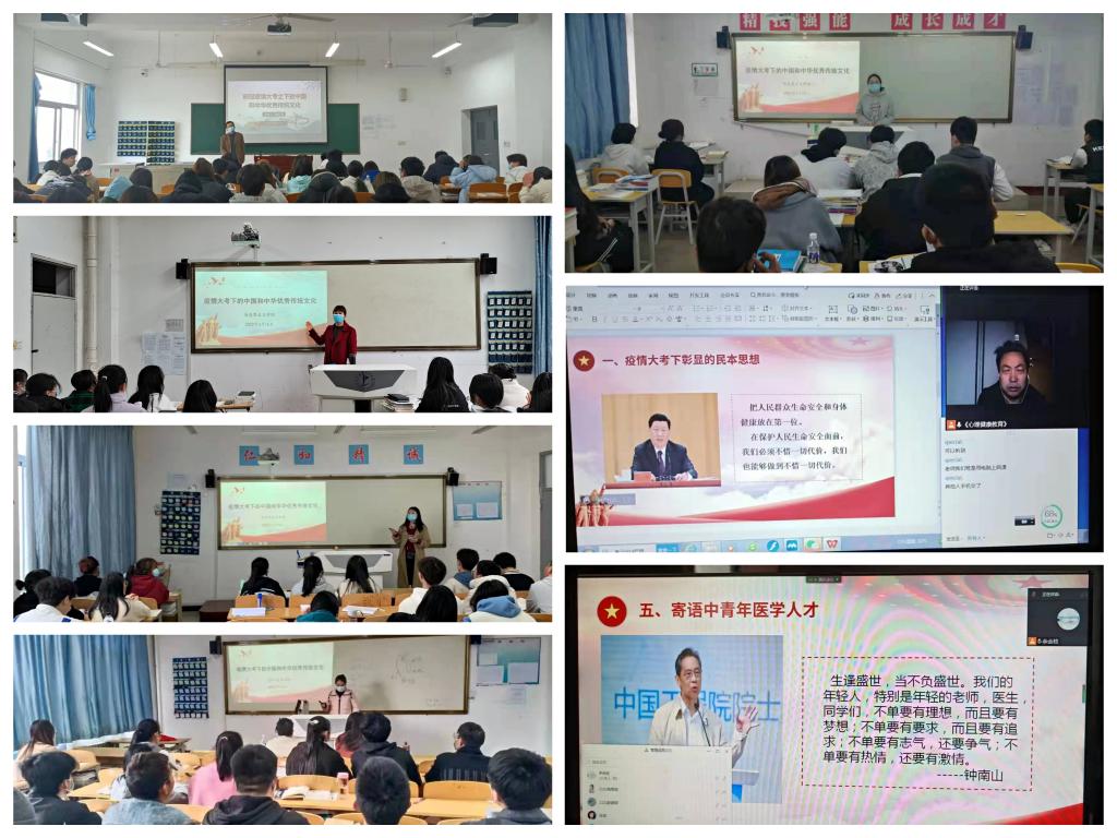 3月18日起,51名专兼职思政教师陆续在《毛泽东思想和中国特色社会主义理论体系概论》《心理健康与职业生涯》等课程中融入疫情防控知识及思政育人元素,为全校21级和19级五年制123个教学班共上123节“抗疫”思政大课。课中,老师们立足疫情防控实际情况,结合所带班级、专业、学生特点引导学生了解、认识本次疫情,鼓励学生积极参与防疫抗疫,通过阐述中华优秀传统文化中的“民本”思想和集体精神在疫情防控中发挥的积极作用,使学生从中汲取战胜疫情的巨大力量。课后,组织学生集体讨论、撰写心得体会,分享学习感悟。