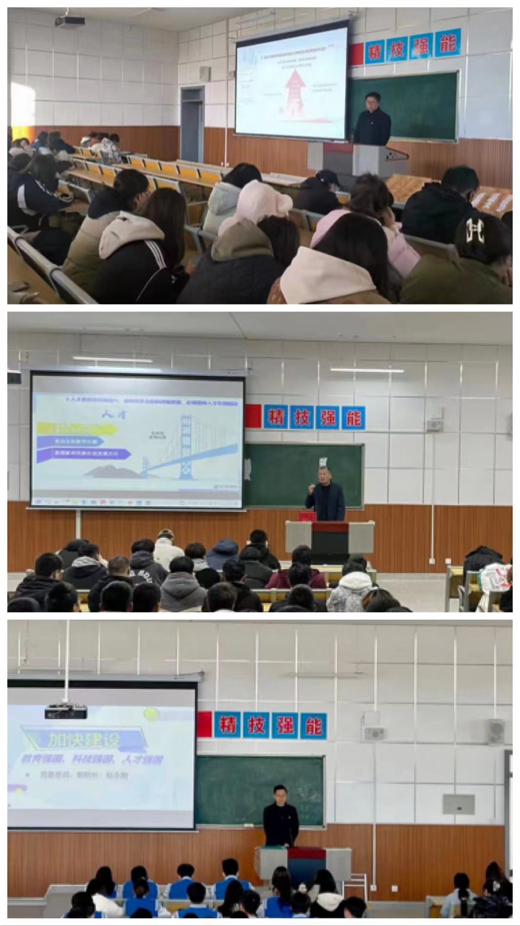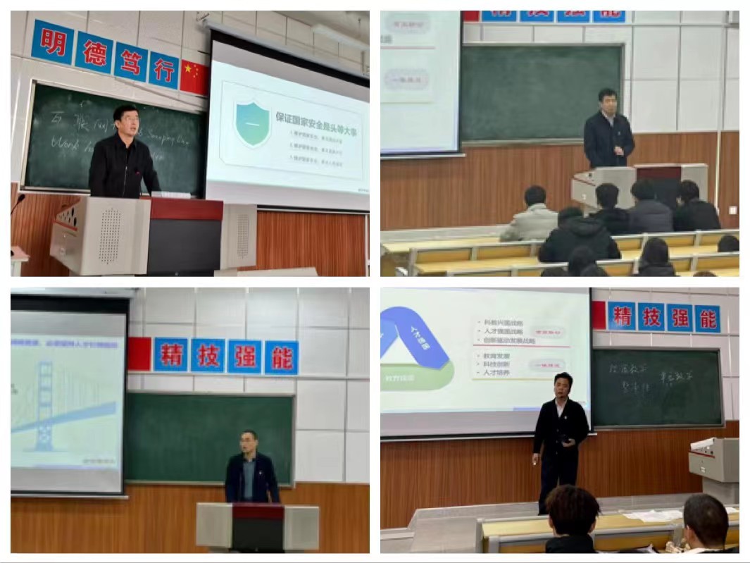院领导分别围绕党的二十大报告提出的“要坚持教育优先发展、科技自立自强、人才引领驱动,加快建设教育强国、科技强国、人才强国”重要战略,以《加快建设教育强国、科技强国、人才强国》为题,从新时代大学生的角度出发,对教育、科技、人才作为全面建设社会主义现代化国家的基础性、战略性支撑作了系统全面、深入浅出的阐释。教育广大青年学生正确看待世界百年未有之大变局和中国发展大势,深刻感悟中国共产党百年艰辛历程、丰功伟绩和中国特色社会主义制度优势,全面提升青年学生的时代责任感、文化认同感、强国使命感,进一步坚定“四个自信”、增强“四个意识”、做到“两个维护”。