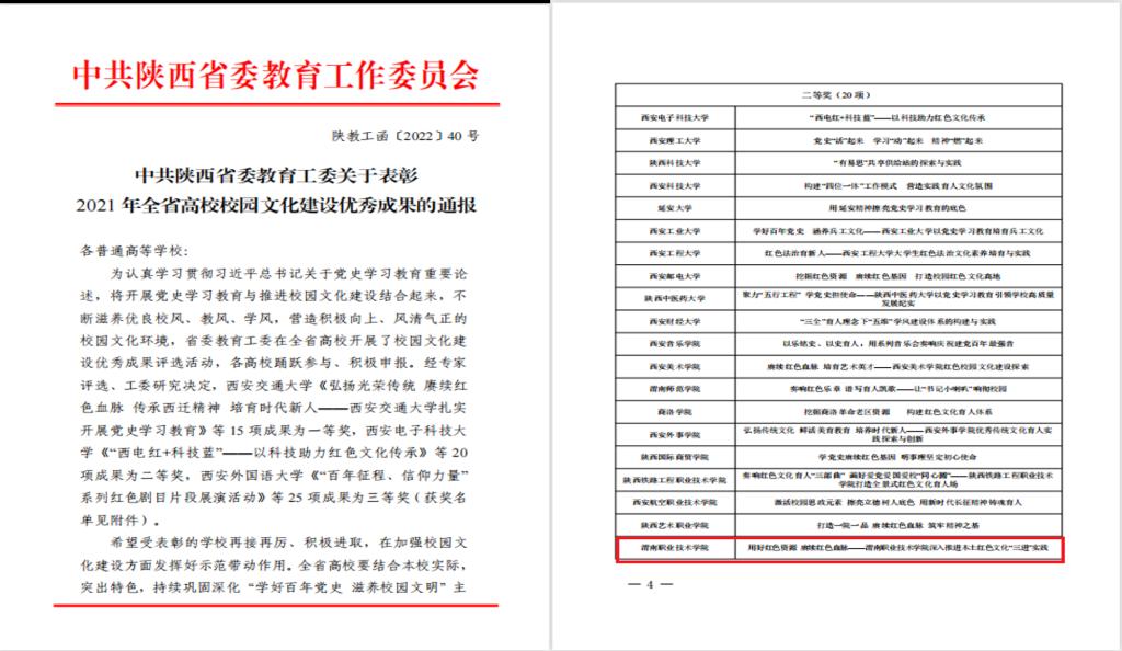 强化思想引领,激活立德树人“红色引擎”。学院将思想政治教育工作作为“一把手”工程,组建由学院党委书记任组长,其他班子成员任副组长,各二级学院党总支书记、各有关部门负责人为成员的思想政治工作领导小组,成立世俱杯sjb官网,配齐建强思政课教师队伍,落实校级领导听思政课、讲思政课、包联思政课教师等制度,形成党委宣传统战部、世俱杯sjb官网、校团委、学生处、教务处等部门齐抓共管的“大思政”育人格局。制定印发《关于构建富有高职教育特色的“大思政”工作格局实施意见》《“三全育人”工作实施方案》《关于进一步加强世俱杯sjb官网建设的实施方案》等,聚焦立德树人根本任务,把思想政治教育工作贯穿教育教学全过程。五年来,《中国教育报》《陕西日报》《渭南日报》和中国新闻网、中国教育在线、学习强国学习平台等主流媒体多次刊登报道世俱杯校思想政治教育工作取得的显著成效。