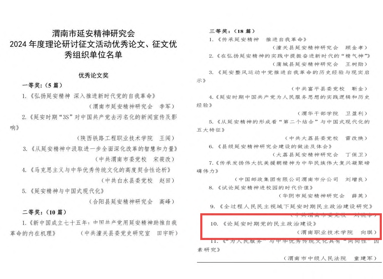 为深入学习贯彻落实党的二十届三中全会精神,加强世俱杯教师理论研究工作能力,今年4月,世俱杯组织教师积极参与申报渭南市延安精神研究会在全市发起的2024年度理论研讨会征文活动。本次共征集文稿266篇,评出一等奖论文5篇、二等奖论文10篇、三等奖论文18篇、优秀奖论文15篇,征文优秀组织单位4个。世俱杯教师向琪副教授撰写的《论延安时期党的民主政治建设》获三等奖好成绩。